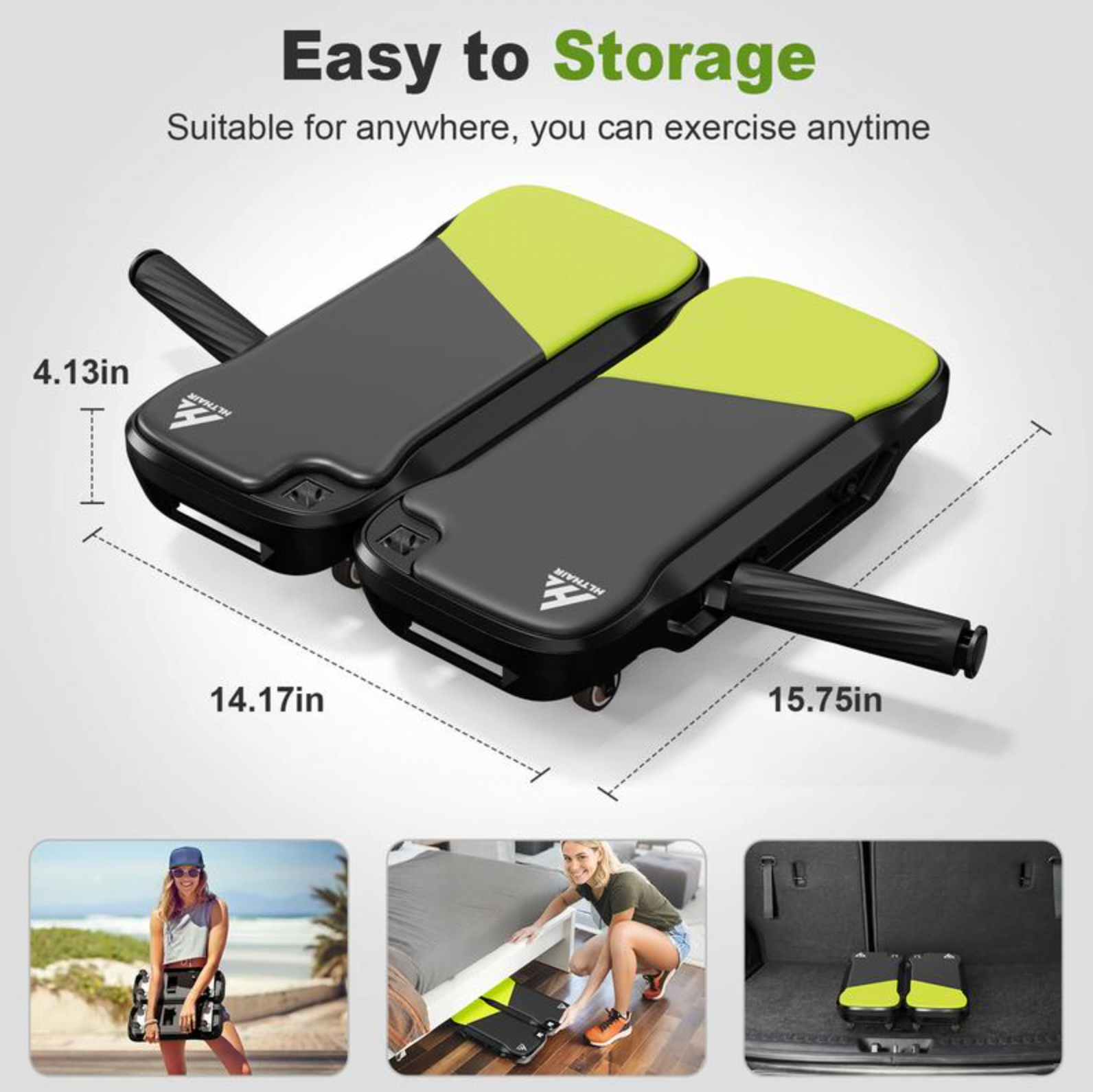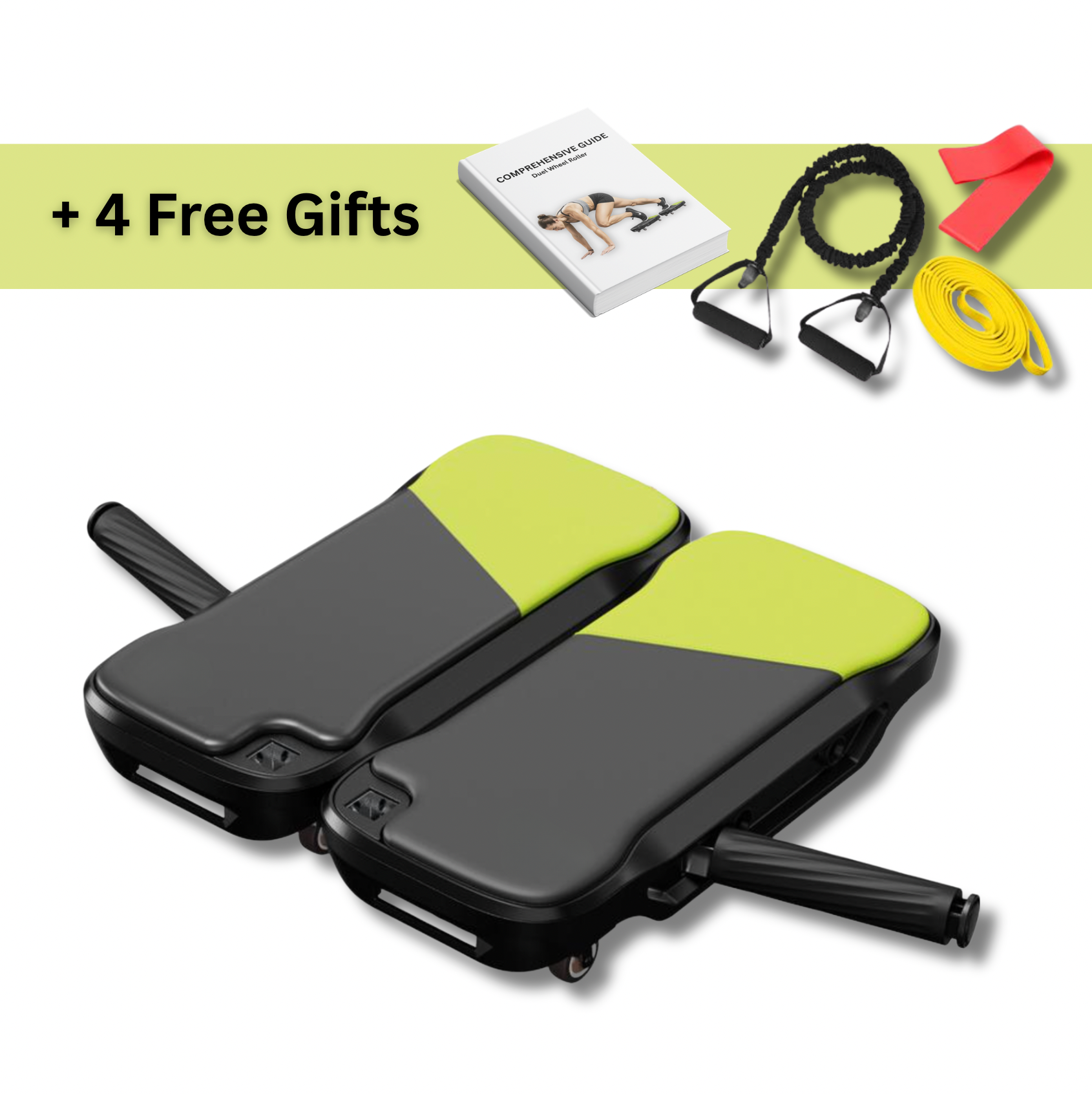 Roll out for abs. Detach for arms. Flip for legs. One device replaces butterfly press, leg curl, ab cruncher, and 7 other machines—all from your living room floor.